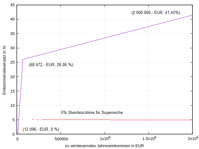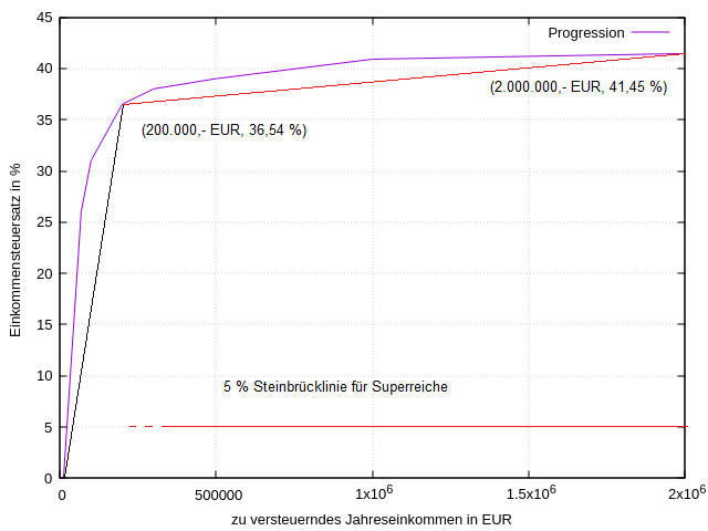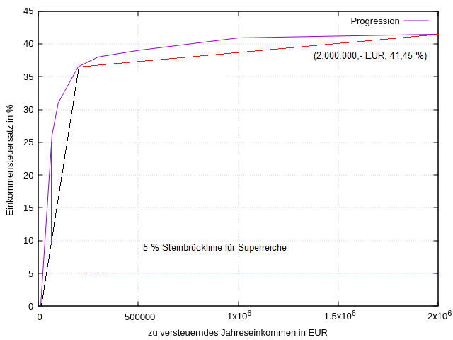 Wesentlich besser wird die Näherung also, wenn man die Punkte (12.096,- EUR, 0,00 %), (200.000,- EUR, 36,54 %) und (2.000.000,- EUR, 41,45 %) durch Strecken verbindet. Durch vereinfachte Darstellung wird auch sofort klar, was passiert, wenn man die Einkommensgrenze des Existenzminimums oder des "Spitzensteuersatzes" verschiebt.