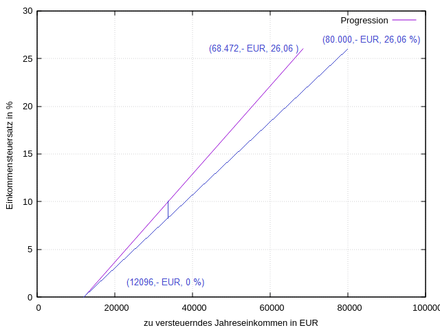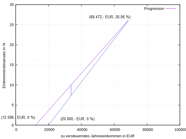 Was auch ohne Worte sofort ins Auge springt: Die Progression existiert vor allem ganz links für Einkommen kleiner gleich 68.472,- EUR. 68.472,- EUR sind alles andere als ein Spitzeneinkommen. Das Einkommen, ab dem der Spitzensteuersatz fällig wird, ist ein Witz. Die Einkommenspitze verdient nicht 68.472,- EUR pro Jahr, sondern macht in durchschnittlichen Jahren rund 2,- Mrd. EUR, das sind 5,5 Mio. EUR pro Tag. Die verdienen die Clanmitglieder garantiert nicht durch eigene Arbeit, sondern weil Feudalismus eine Erbkrankheit ist, die es in der sozialen Marktwirtschaft zur Bewahrung von Demokratie und Freiheit rechtsstaatlich auszumerzen gilt (ausmerzen mit e, nicht mit ä). Im Maßstab 5,5 Mio. EUR pro Tag statt 2,- Mio. EUR pro Jahr wäre die Progression für die "Idioten", die jeden Tag aufstehen um für einen neofeudalen Clan zu arbeiten, praktisch eine senkrechte Gerade. Die zwei Geraden sind nur eine erste Näherung, die zeigt, wie der Betrugstricks "linearer Grenzsteuersatz" funktioniert: Eine sehr steile Progressionsgerade für alles unter 68.472.- EUR, und eine deutlich flachere darüber. Tatsächlich ist die Näherung noch noch nicht gut, denn tatsächlich verläuft die Progression auch über 68.472.- EUR umso steiler, je weniger verdient wird. Mit mehr Punkten kann das menschliche Auge den perversen Trick noch besser abhäuten, um in das Innere des Betrugs zu sehen. Das geht dann auch ohne jedes Verständnis für die Mathematik, die sich professorale Finanzwissenschaftler in ihren Gehirnen zurechtgewichst haben: